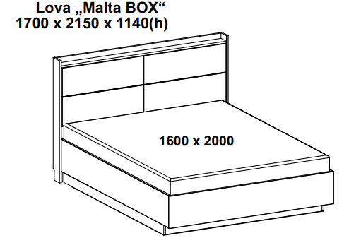 Lova MALTA BOX – minimalistinis ir ergonomiškas modelis, su integruota lentynėle galvugalio viršuje. Korpusas pagamintas iš kokybiškos LMDP plokštės.